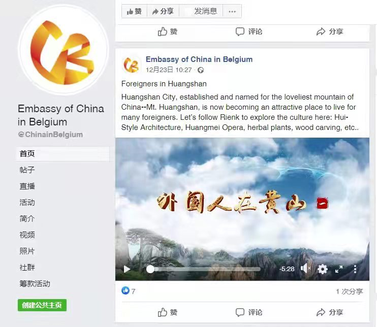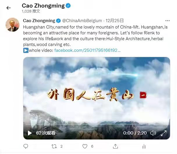 中国驻比利时大使关注转发《外国人在黄山》系列微视频