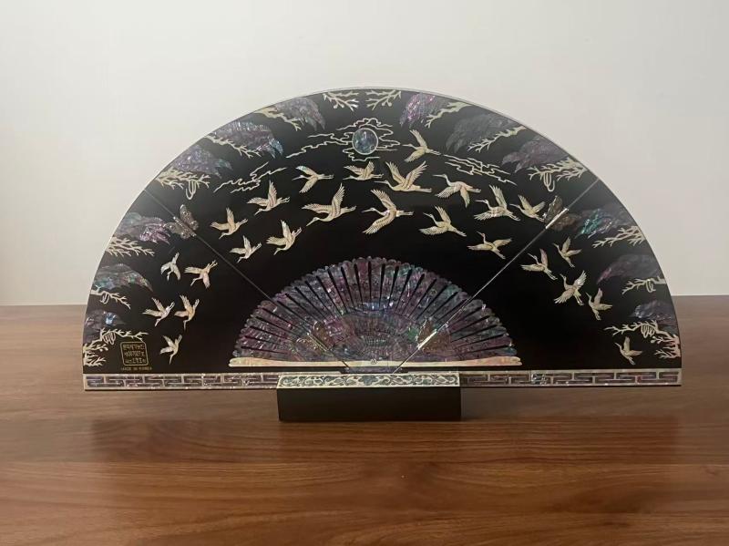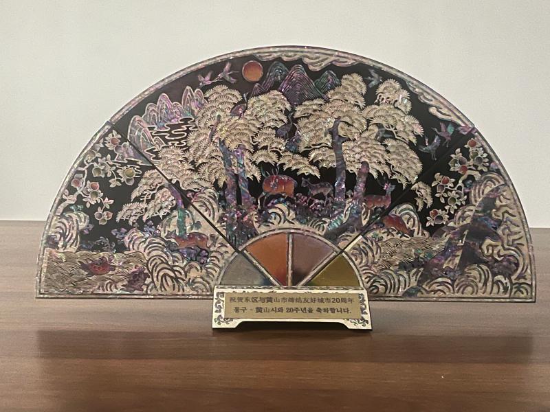 近日,黄山市外办收到国际友好城市韩国大邱广域市东区寄赠的友城结好20周年纪念礼品——螺钿漆器摆件。摆件呈扇形,上嵌海贝、珍珠制成的精美纹饰,一面为苍松福鹿,一面为祥云仙鹤,表达了对黄山市的美好祝愿,以及对双方友谊长青的希冀。